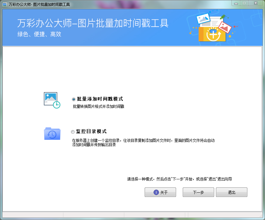 您可以选择“批量添加时间戳模式”或“监控目录模式”选项进行图片的批量处理,然后点击“下一步”按钮。