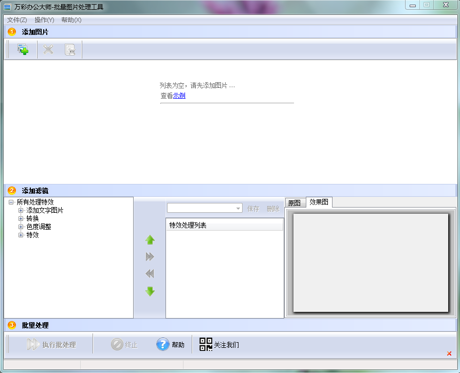“添加图片”->“添加滤镜”->“批量处理”,轻松三步即可为图片批量添加特效,省时高效。