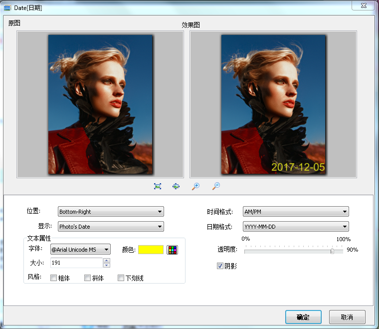 1.日期:双击该选项打开弹窗,然后编辑日期的位置、文本属性、大小、风格、时间格式、日期格式、透明度及阴影效果,设置完毕后点击“确认”按钮。