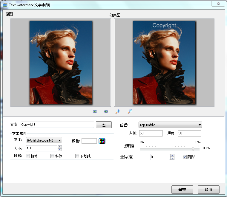 2.文字水印:双击该选项打开弹窗,然后编辑文本水印的文本、文本属性、字体、字体大小、风格、颜色、位置、透明度、旋转度及阴影效果,设置完毕后点击“确认”按钮。