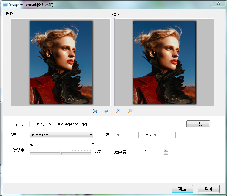 3.图片水印:双击该选项打开弹窗,然后点击“浏览”按钮添加图片水印,设置图片水印的位置、透明度及旋转度,设置完毕后点击“确认”按钮。