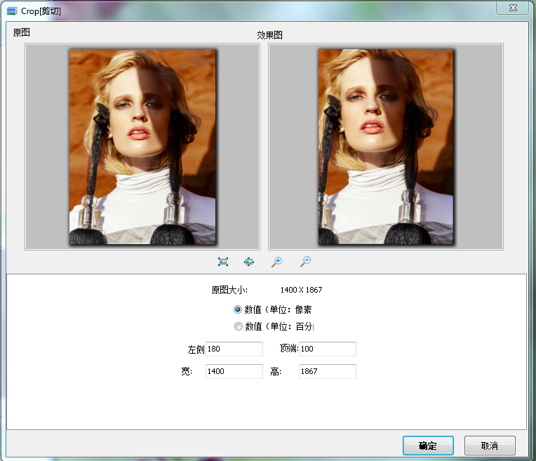 3.剪切:双击该选项打开弹窗,您可以根据数值来剪切图片。选择“数值(单位:像素)”或者“数值(单位:百分比)”选项,然后在下方“左侧”和“顶端”方框中输入需要剪切掉的数值即可剪切图片,所有设置完毕后点击“确认”按钮。
