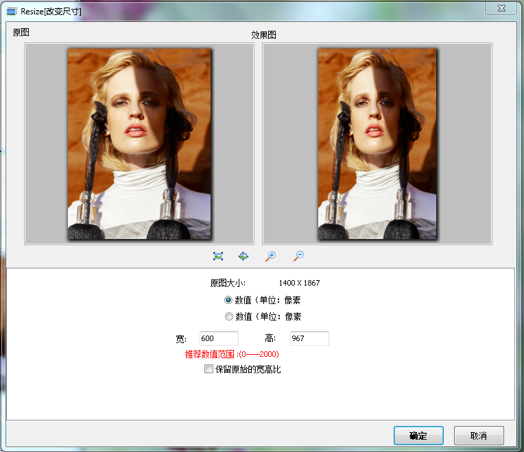 4.改变尺寸:双击该选项打开弹窗,弹窗中显示图片的原图大小,您可以选择“数值(单位:像素)”或者“数值(单位:百分比)”选项来改变图片的大小(推荐数值范围为0-2000),只需在“宽”和“高”的方框中输入数值即可改变图片尺寸,可设置图片保持原始的宽高比。所有设置完毕后点击“确认”按钮。