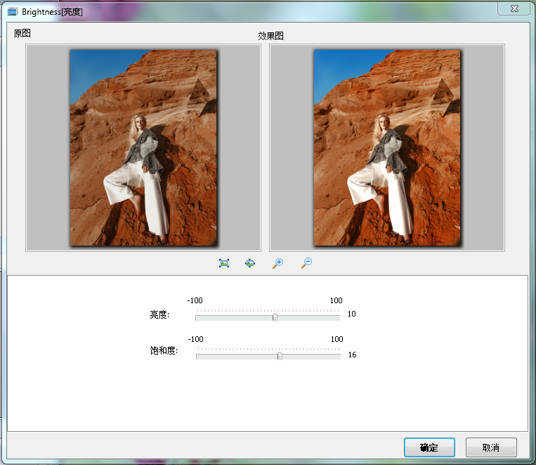 2. 亮度:双击该选项打开弹窗,拖动数值刻度直接调整照片的亮度和饱和度,然后点击“确认”按钮。