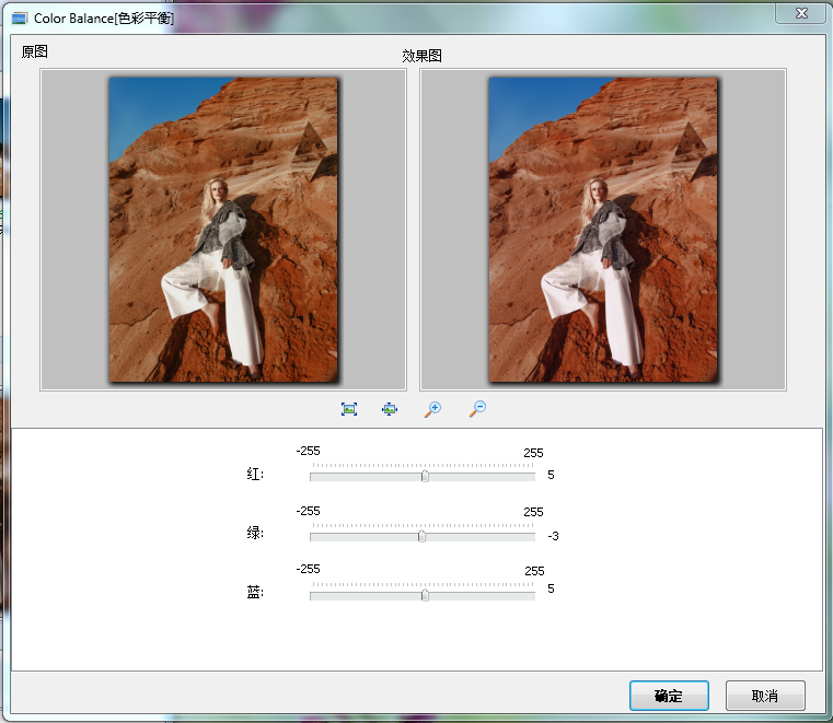 3.色彩平衡:双击该选项打开弹窗,拖动数值刻度直接调整 “红”“绿”“蓝”三原色,设置好图片的色彩平衡,然后点击“确认”按钮。