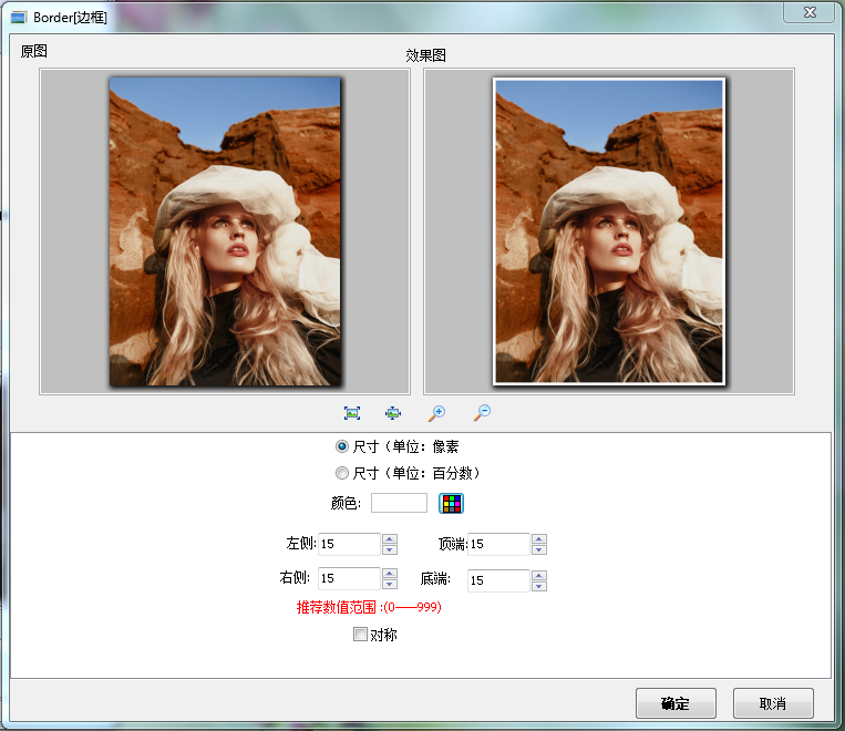 3.边框:双击该选项打开弹窗,选择一种尺寸形式: 以像素为单位或以百分比为单位,然后点击“颜色”选项为图片边框选择一种颜色,自定义边框“左侧”、“右侧”、“顶端”、“低端”的边框大小(推荐数值为0-999),勾选边框“对称”设置,最后点击“确认”按钮。
