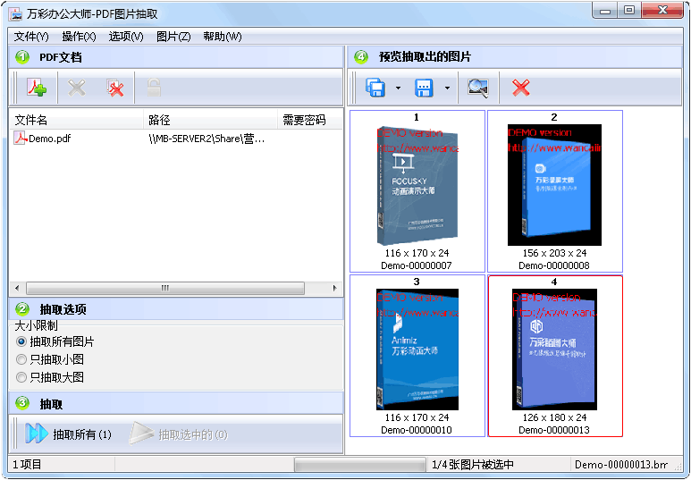 点击“抽取选中的”即可从文档视窗所选中的PDF文件中抽取图片。