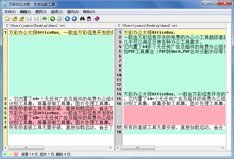 以左侧文件为标准,右侧文件新增了14行,修改了1行,删除了4行。