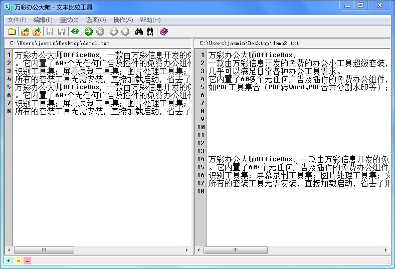 通过使用文本比较工具, 可以快速比较两个文件的内容区别。 内容不同之处会被自动标记成不同的颜色,清晰明了,方便修改。在这个工具里面, 您可以选择自定义高亮颜色, 设置水平分割方式, 搜索查找替换文件内容等。